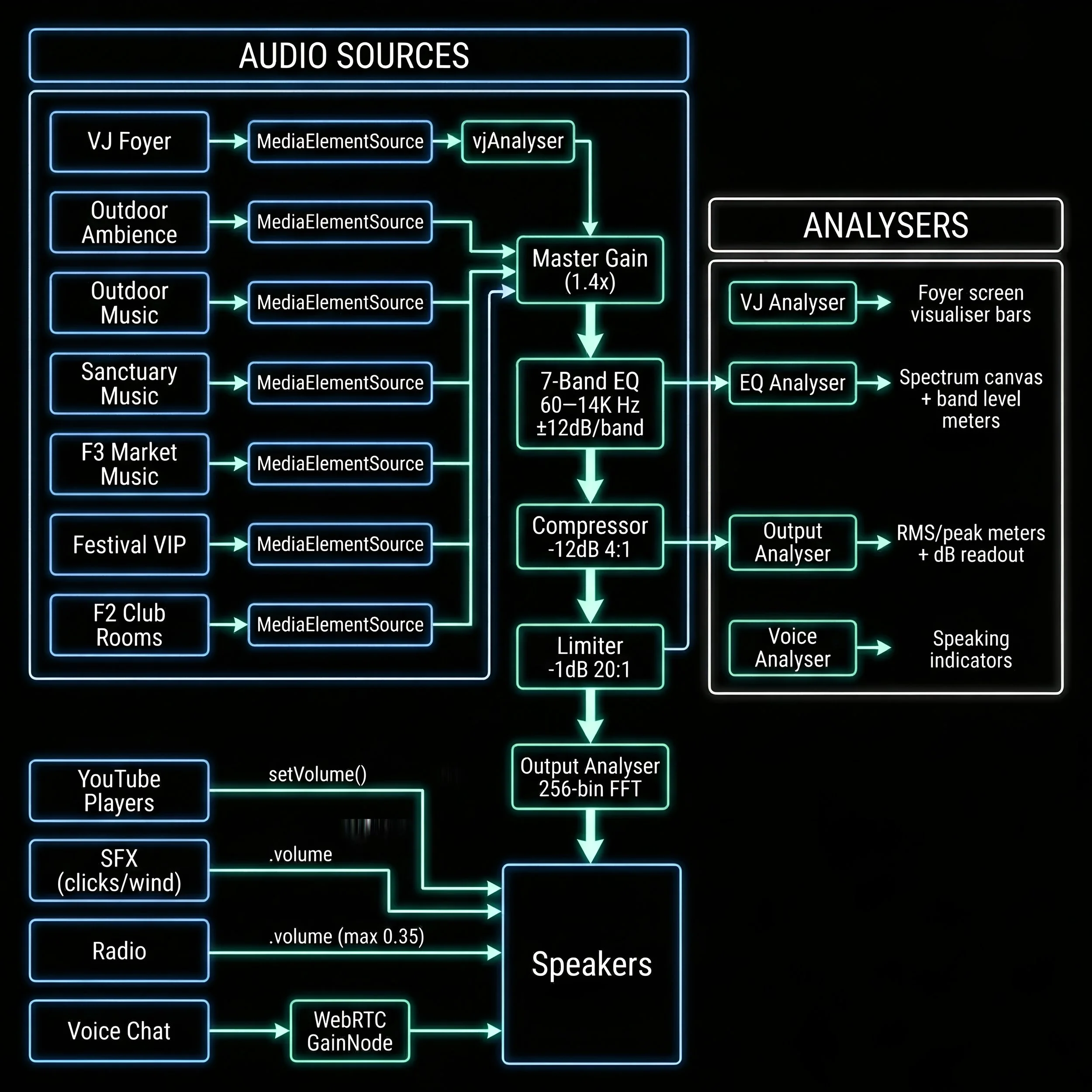 SourceTypeDescriptionVJ / Foyer MusicMediaElementSource β Analyser β masterGainThe main conference music system. Supports both audio and video (with video texture mapped to the foyer screen). Includes its own AnalyserNode driving the VJ bar visualiser.Outdoor AmbienceHTMLAudioElement β masterGainNature/wind loop that plays in exterior zones.Outdoor MusicHTMLAudioElement β masterGainPlaylist or single track for outdoor areas.Sanctuary Foyer MusicHTMLAudioElement β masterGainCalming ambient music in the wellness sanctuary foyer.Floor 3 Market MusicHTMLAudioElement β masterGainBackground music for the third-floor market zone.Festival VIP MusicHTMLAudioElement β masterGainAudio for the festival VIP area.Floor 2 Room AudioHTMLAudioElement Γ N β masterGainEach club room (Dance Floor, Chill Room, Club Hub, Live Stage) has its own routed audio element.